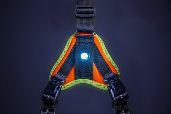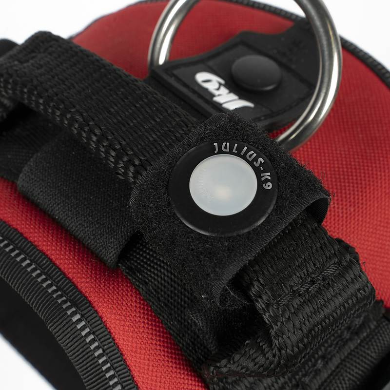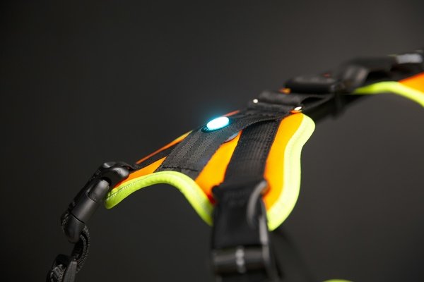 Am Halselement des JK9®Mantrailing Hundegeschirrs kann der JK9®LED SPOT ohne Klettverschluss in die Lampenhalterung eingeklickt werden.
